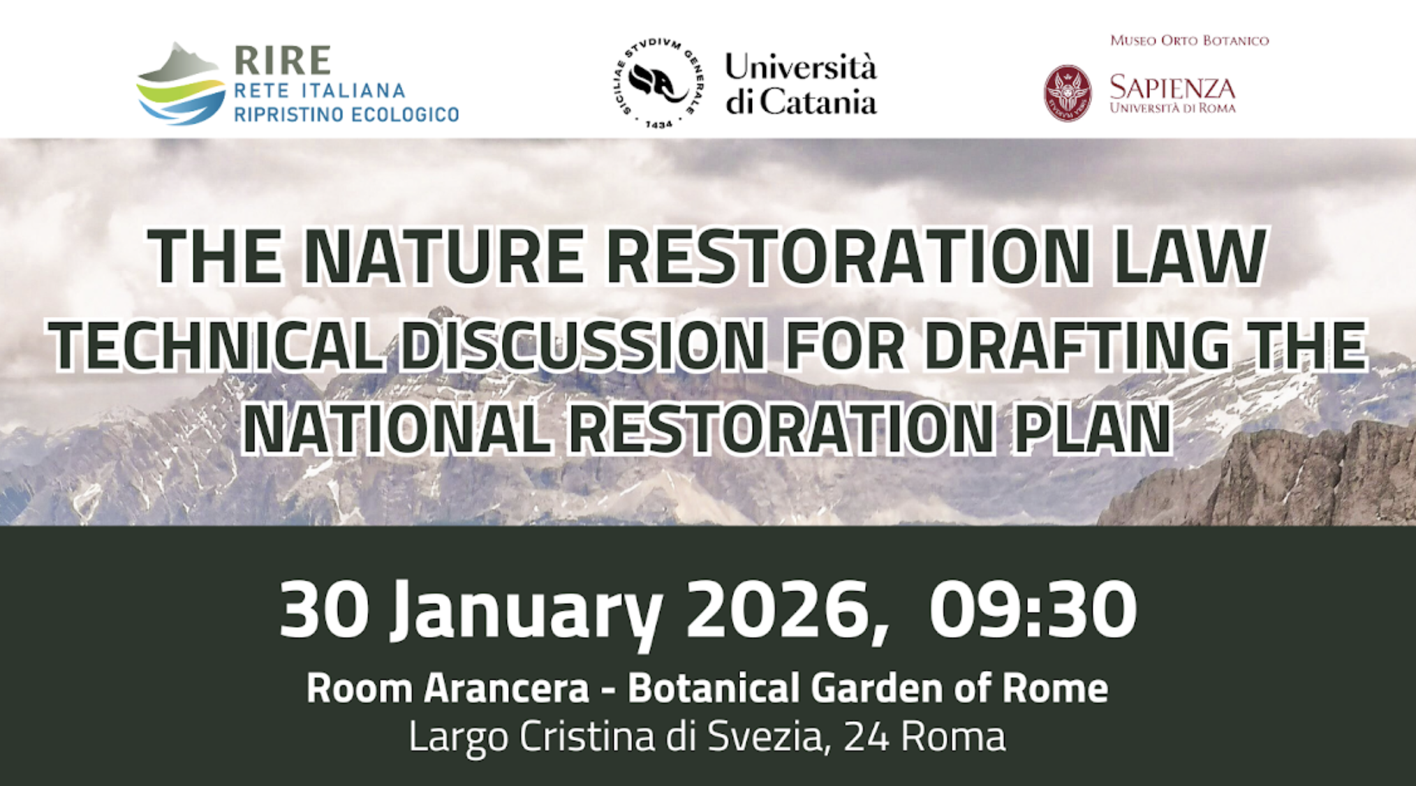 Organised by the Italian Network for Ecological Restoration APS together with the national research project PRIN 2022 PNRR “Restoring Biodiversity as a Tool for Climate Change Mitigation” this meeting focuses on the National Restoration Plans in the EU Nature Restoration Law and strategies for supporting the development of the Italian National Restoration Plan.